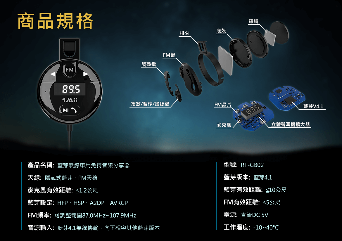 ✦ GB02透過FM和車內音響通訊,不需要音源孔(AUXIN)即可安裝