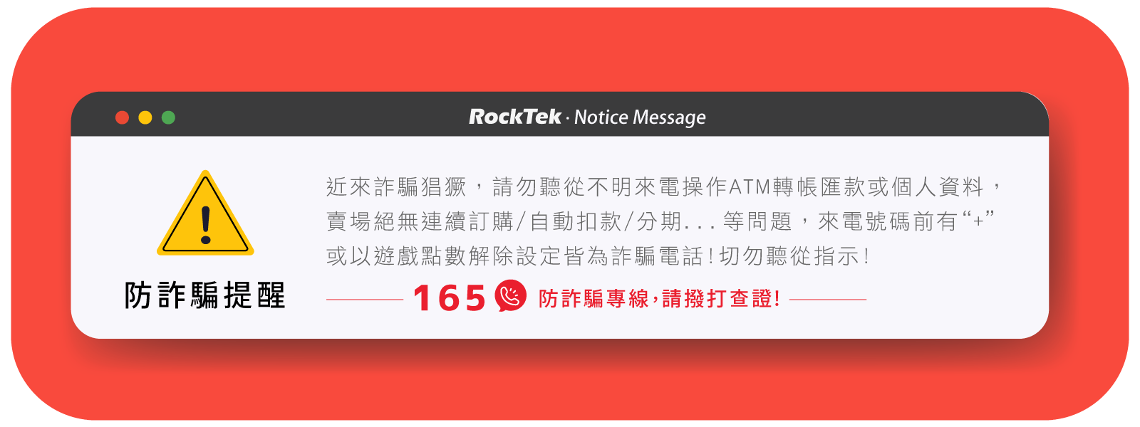 「 RockTek 」不會利用不明電話詢問您的信用卡資料或ATM完整帳號,不會要求您多付款,不會要求退刷再重新付款....等,如接獲相關不明電話指示異常操作,請務必小心提高警覺,切勿聽從指示! 請立刻撥打 165防詐騙專線 檢舉求證或是來電與我們聯繫確認。