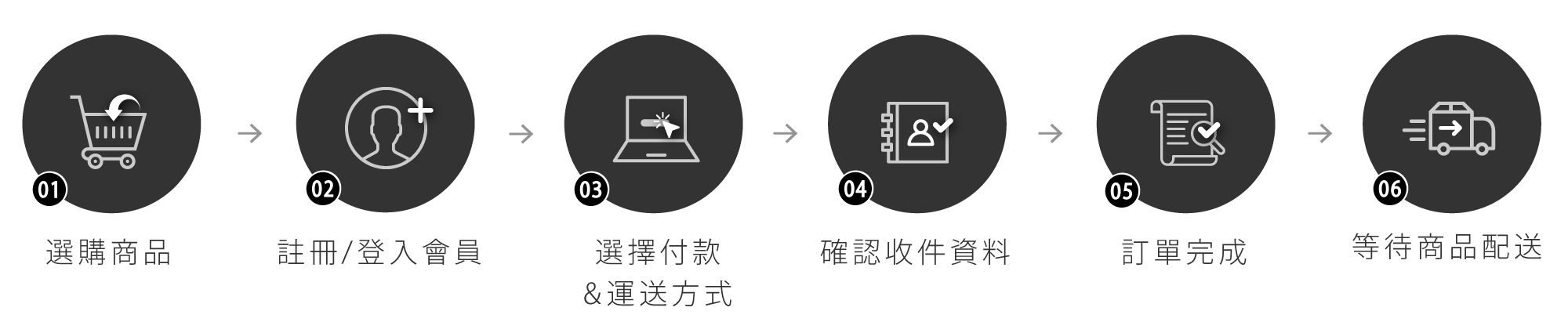 1. 【選購商品】 →   2. 【註冊/登入會員】  →  3. 【選擇付款&運送方式】  →  4. 【確認收件資料】  →  5. 【訂單完成】  →  6. 【等待商品配送】